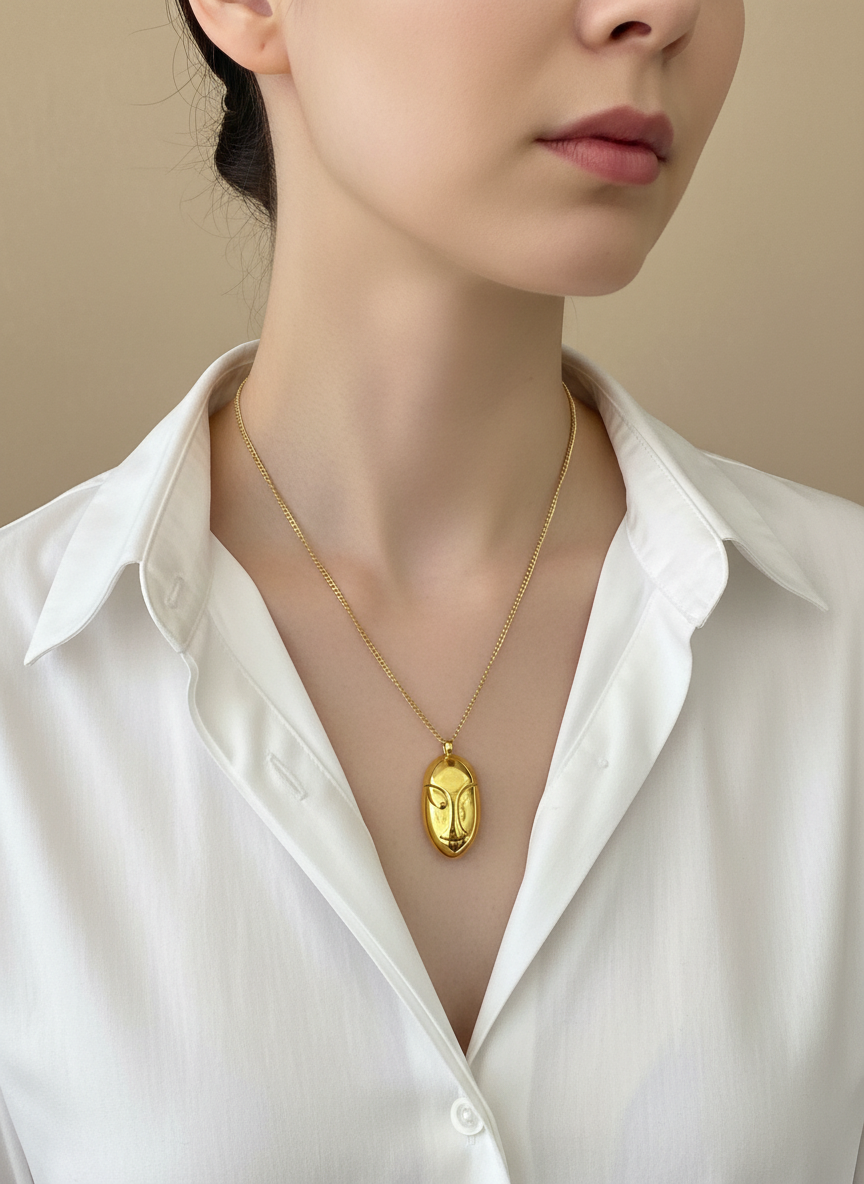 Stand out in style with the Raniya Artistic Face Chain. An eye-catching gold-plated pendant inspired by modern art and creative spirit. Lightweight and comfortable, this necklace is perfect for making a bold statement while keeping elegance at the center of your look. Own your uniqueness with Raniya Jewellery.